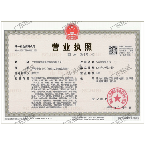 廣東銘誠智能建筑科技有限公司成立于2008年,公司注冊資金為6000萬元,集辦公裝修、酒店裝修、家庭裝修、軟裝裝飾、娛樂場所裝修為一體的裝飾公司,率先提出“創造現代人文空間,挑戰業界高峰”的雄壯口號,并以此為目標,完成了一大批具有影響力的大型公裝工程:其中包括廣州國際中醫藥展貿中心、奧飛澄海音樂廳、澄海區國家稅務局、澄海興信小額貸款、澄海潮商村鎮銀行、汕頭龍湖賓館、澄海豪庭大酒店、御園國際飲食城、澄海福晉軒酒家、享樂匯保健有限公司、假日商務酒店、尚景康園物業、星輝車模股份有限公司、奧飛動漫有限公司、香港國際玩具、汕頭萬基貿易有限公司、泰興源實業有限公司、汕頭皇冠玩具有限公司等;家裝工程包括南澳黃金海岸整幢的精裝房、中信華府、富春華庭、金信鳳凰名城、凱旋花園、中信金城、柏嘉半島、陽光海岸、金葉島等高等住宅。 ? 廣東銘誠智能建筑科技有限公司經過十余年的建筑裝飾裝修施工領域項目積淀,于2018年2月取得“建筑裝修裝飾工程專業承包二級”、“建筑機電安裝工程專業承包三級”、“建筑工程施工總承包三級”、“施工勞務不分等級”、“安全生產許可證”等專業資質,并于2021年8月建筑裝修資質正式升級為“建筑裝修裝飾工程專業承包一級”。這是對企業規模、工程業績、管理水平、誠信表現的肯定,是企業實力與能力的展現。 ? 公司每一項工程都始終堅持“精美設計、精心施工、確保合同承諾;勤奮開拓、追求突出、創造時代精品”的質量方針,力爭做一項工程,樹一座豐碑。 ? ?銘誠擁有一支由專業的營銷精英和客戶顧問組成的營銷隊伍,勤奮、敬業的每一位銘誠員工將本著“贏在別人休息時”的專業精神,為客戶提供全程營銷及售后服務,確保客戶的合法利益,提供體貼周到的服務,做到讓顧客滿意。 ? 銘誠擁有一批資老牌室內環境設計師,以“現代人文空間”為設計理念,為客戶提供人性化、差異化、智能化的室內環境設計服務,準確的將人性化特點與室內環境相融合,達到了“現代人文空間”的和諧統一。 ? ? ? ?自主創新、視社會責任為己任的精神使我們在發展的道路上屢獲殊榮:不斷提升的銘誠品牌知名度和美譽度,靠的是優質的產品,靠的是不斷提升的營業績,靠的是國內的核心技術和誠信的服務。相信通過銘誠人的努力,銘誠將會不斷以新的姿態為提升廣大消費者的生活質量做好服務,為中國裝飾行業設計創新做出突出貢獻。 ? ? “忘掉競爭、共